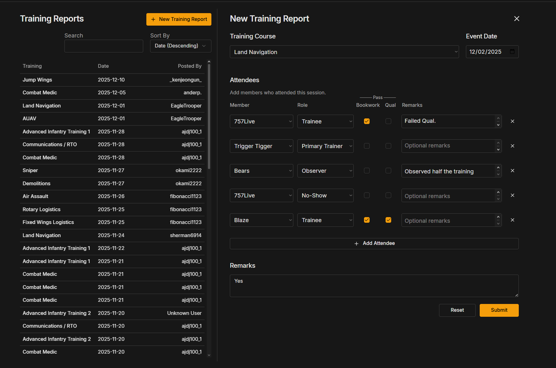 When picking the a name twice in a new training report / The submit button is available and clickable but the report does nothing and gives no feedback that there is an issue.