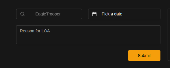 Name(The Display Name of the Category) "Military", "Personal", "Vacation" etc.Max Length(The Max Length a LOA can be submitted for) This can be stored in Hours, Days, Weeks, Months, (Whatever is easiest) Can also be setup to be more dynamic so its 1M, 1W, 5D, etc and can be parsedEnabled(Allows for the option to be enabled / disabled as an option for the formThe LOA form should split the