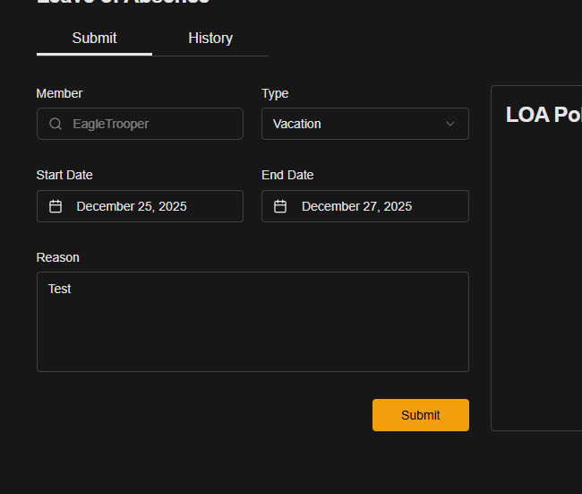 -Unsure if im stupid, but there was litterally no notification that the LOA got submitted, i was about 2 seconds from telling u its broken, and then i noticed under history that it WAS submitted each time i clicked submit, it just gave zero indication that anything had happened, leading me to assume it was broken. so add some sort of "LOA submitted" notification